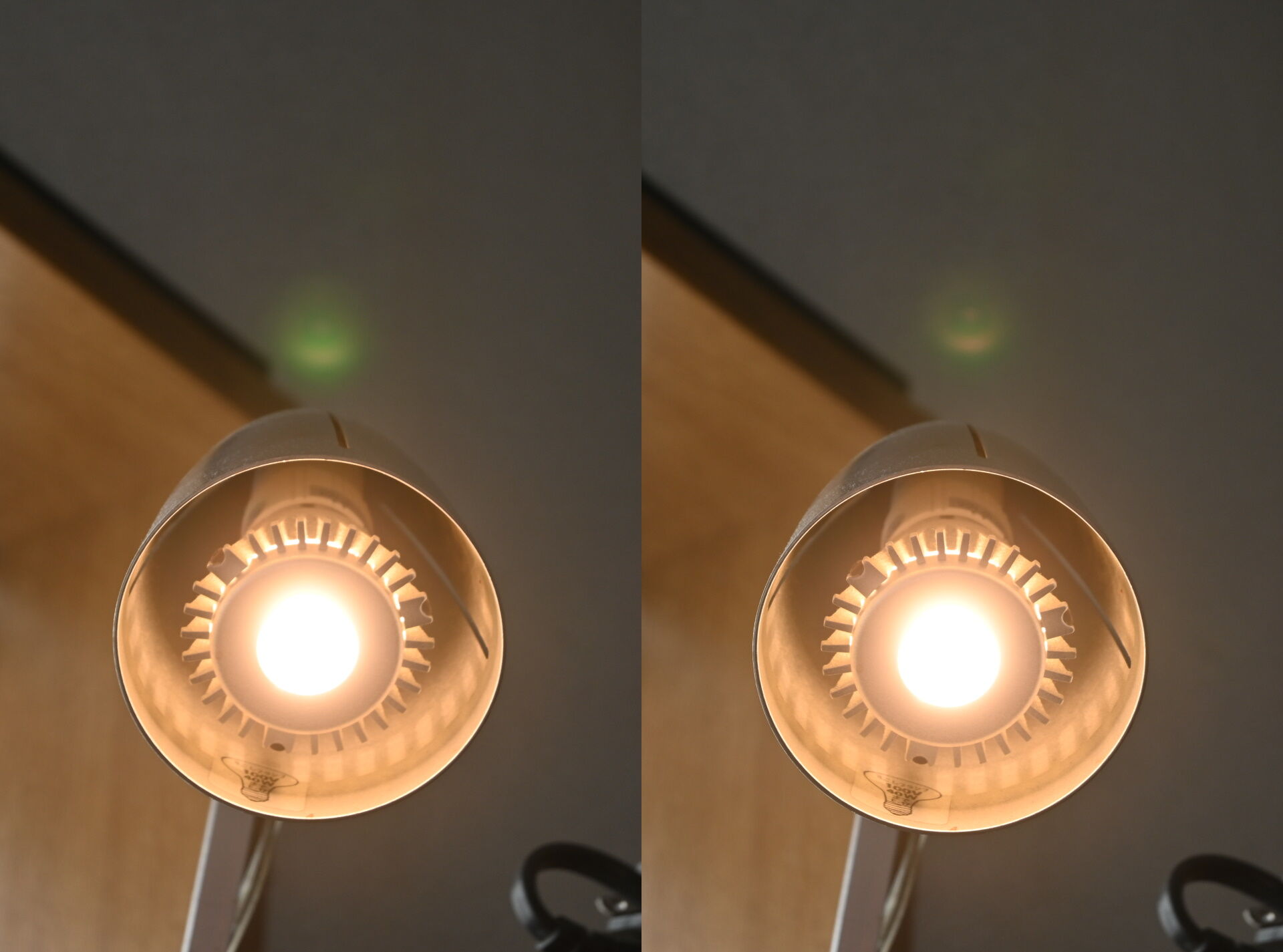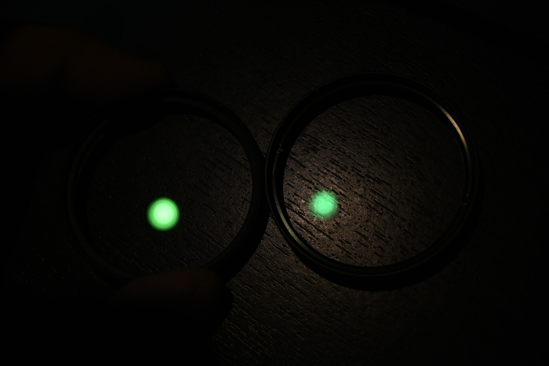 反射光を見てみると、なんかちょっと反射光が明るいような・・。元のMC-UVフィルタと比べてみます。左が今回のDHGスーパー、右が元のMC-UVフィルタです。裏の机の反射があってわかりにくいですが、だいぶDHGスーパーのほうが明るいようです。