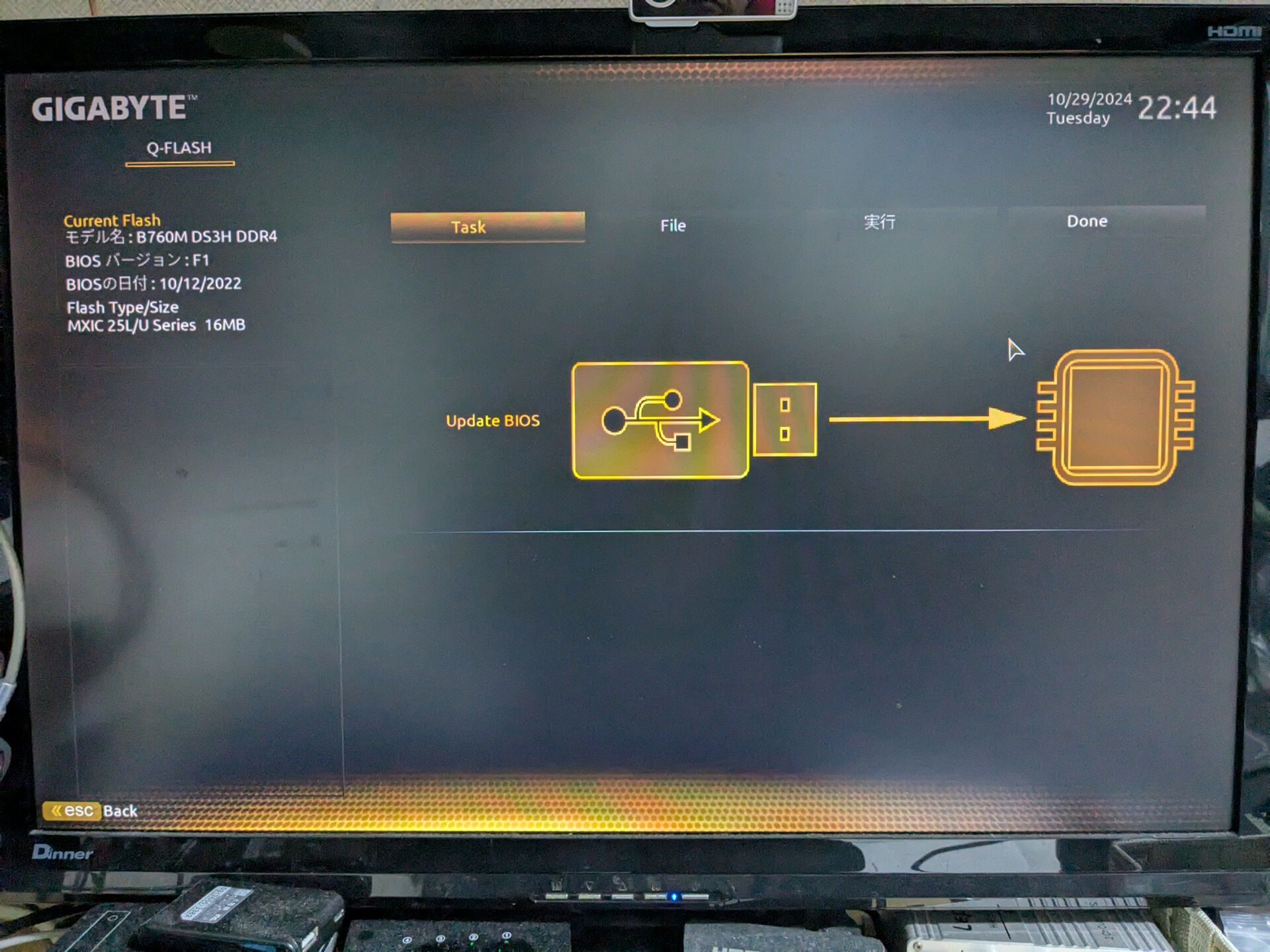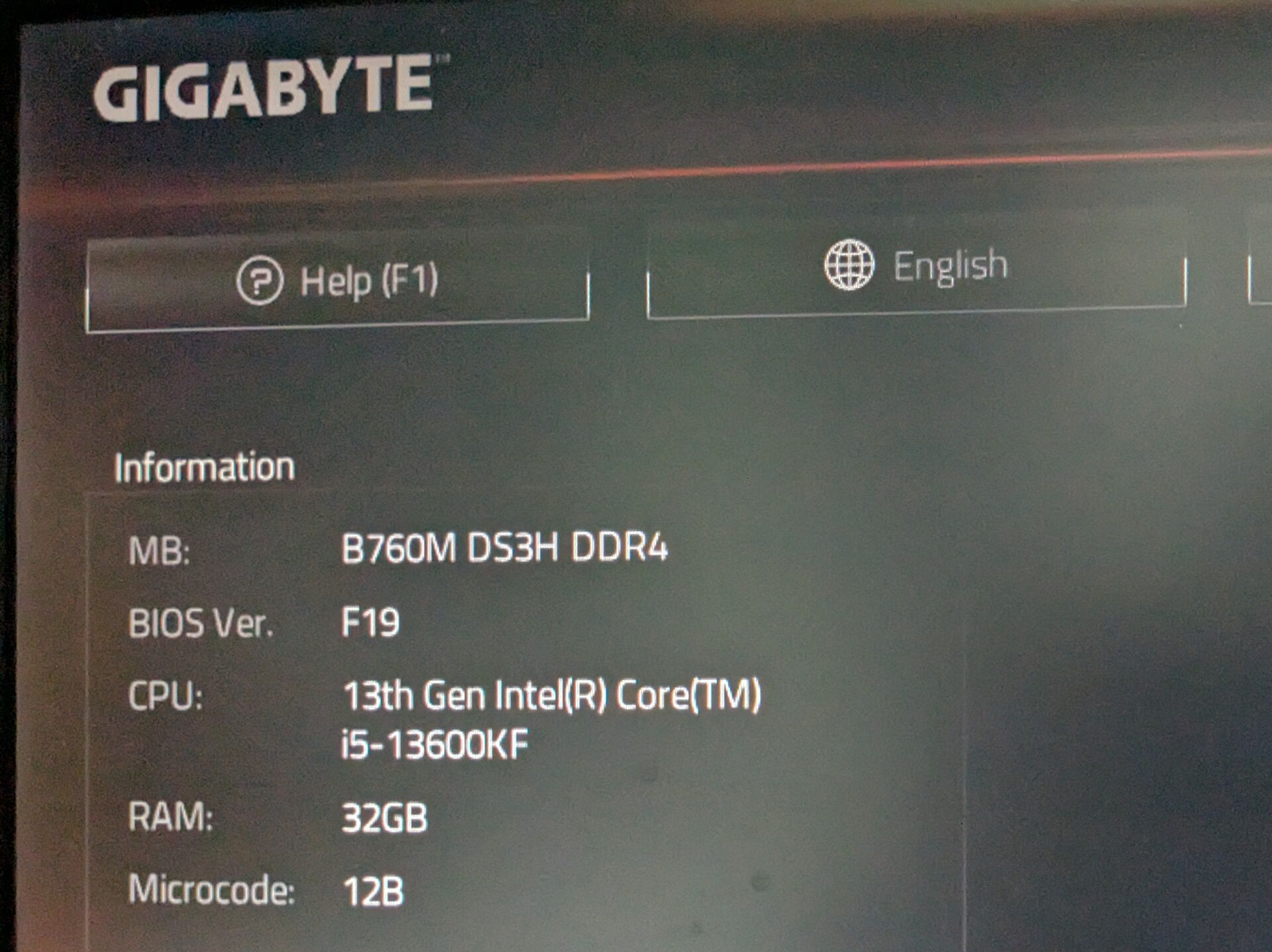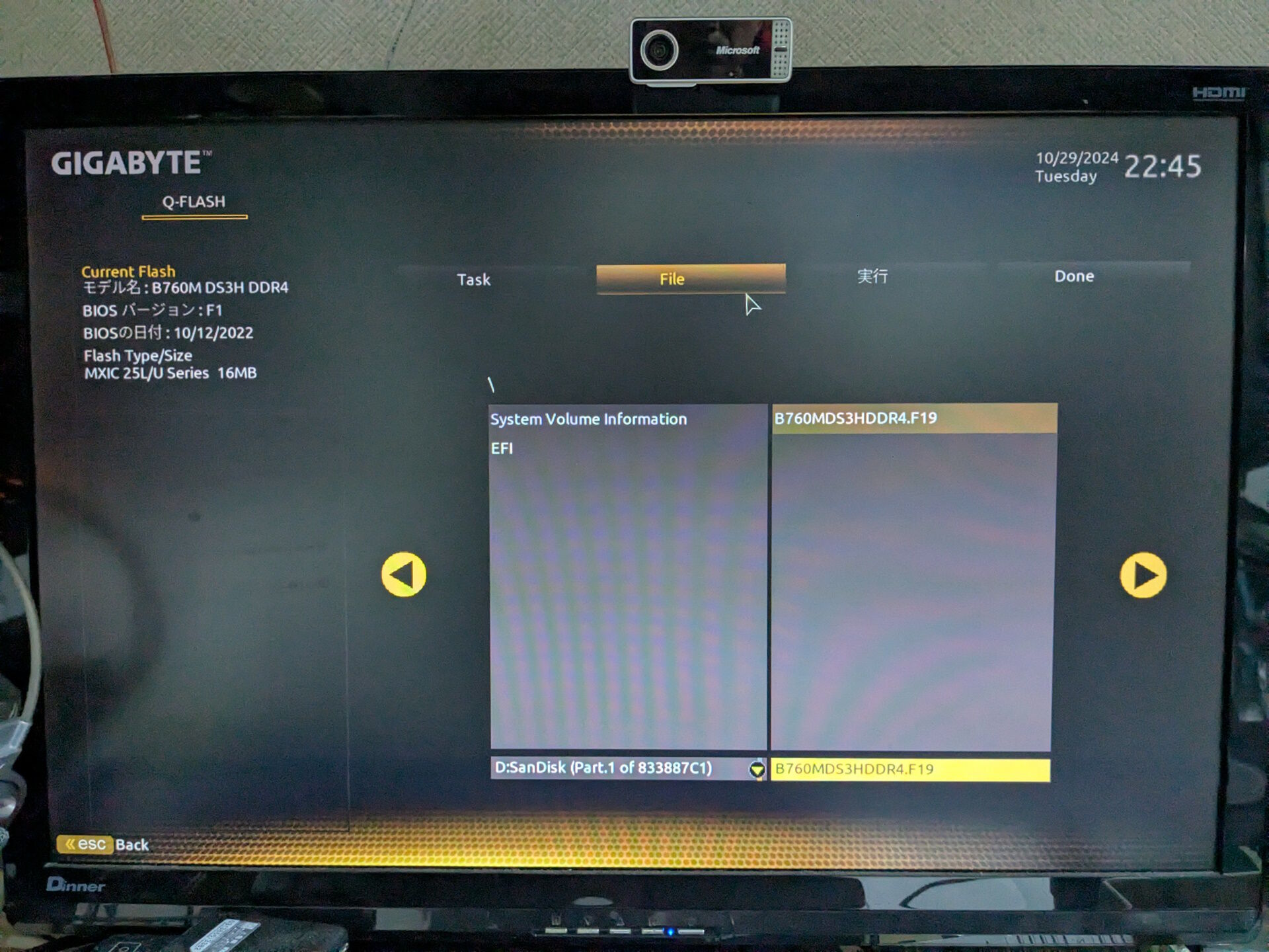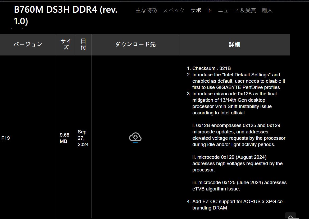 MBはGigabyte製のB760M DS3H DDR4。Gigabyteのサイトに行ったら、バージョンF19のBIOSで今回の不具合に対応していました。早速これをダウンロードしてアップデートします。