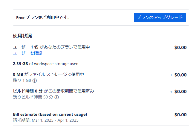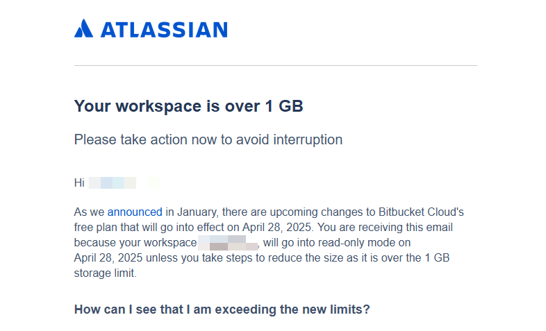 自分が作ったソースはBitbucketで管理していて、Atlassianはその運営会社です。ソース管理はGitHubがポピュラーですが、以前はGitHubは、無料ではソースをprivateな領域に置けなかったのに対し、Bitbucketは最初からprivateな領域に無料で置けたのと、無料プランでも置くファイルのサイズに制限がなかった(リポジトリあたり最大4GB)のでBitbucketを選んだのですが、料金体系が変わって、リポジトリを置くワークスペースあたり1GB、無料プランは1アカウントあたり作れるワークスペースはひとつなので、最大1GBに制限がついてしまったようです。