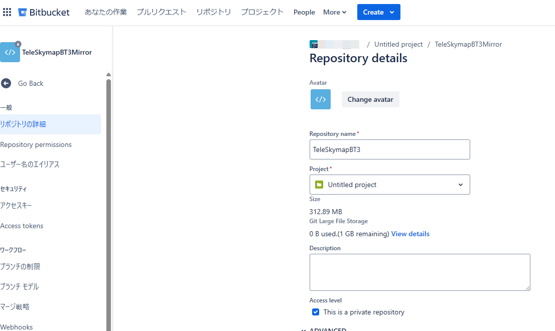 まずはBitbucketで新たなリポジトリを作ります。今回はTeleSkymapBT3Mirrorという名前で作成。