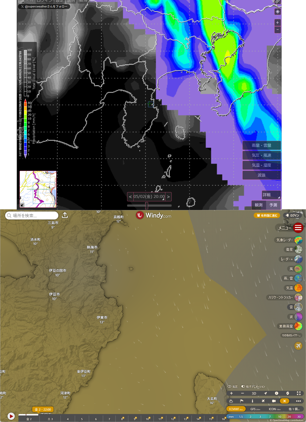 金曜の夜、天城高原に遠征してきました。天気予報では、SCWは20時頃から晴れ、Windyは22時頃から晴れの予報でした。が、昼間は、それはホントか?と疑いたくなるような天気。実際天城高原に向かう途中の車は、ワイパーを高速動作にしても前が見づらいほどの大雨。こんな天気の中で星見に出かけるのは初めてです(笑)。