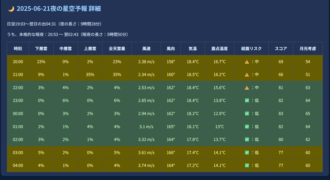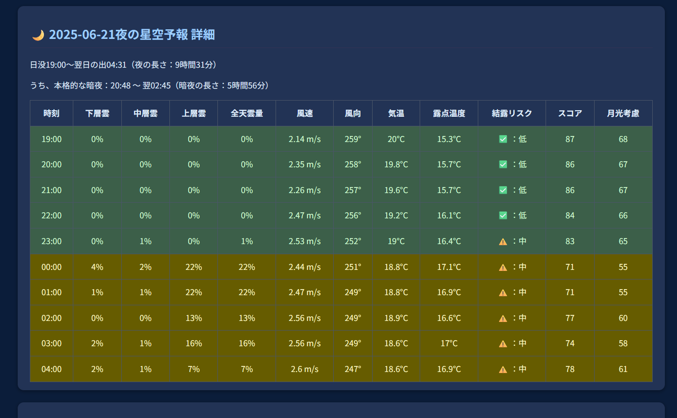地図で観測値を選ぶと、その日と翌日の夜の天気が1時間毎で表示されます。雲量が上・中・下層雲に分けて表示されて、露点から夜露が降りそうかまで表示されます。天文薄明や月の出入りの時間もあって至れり尽くせり。これらの情報を総合して、サイトの名前の通り星を見るのに適しているかを示すスコアを表示してくれます。