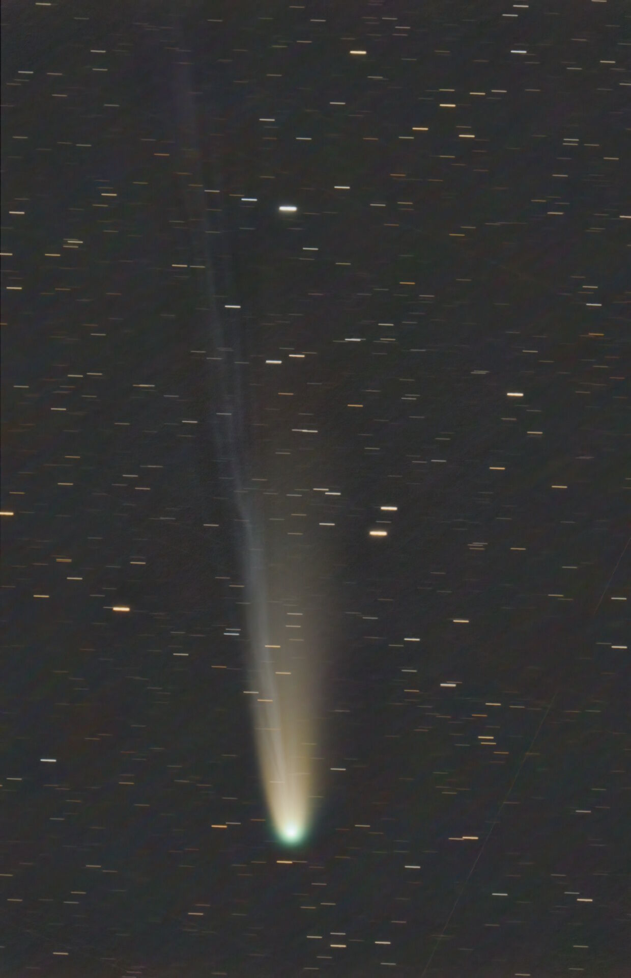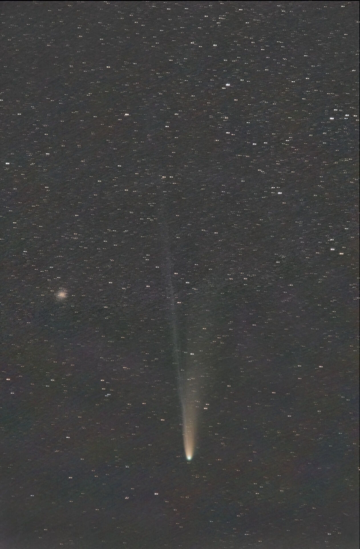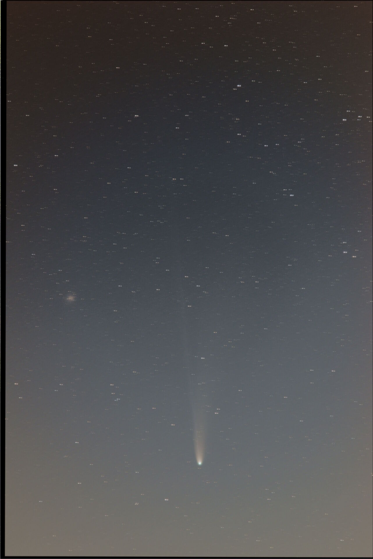 8x42mmの双眼鏡で見ると、満月近い月の明かりで淡いところは見えませんが、それでも1.5°くらいの尾があるのがわかりました。
