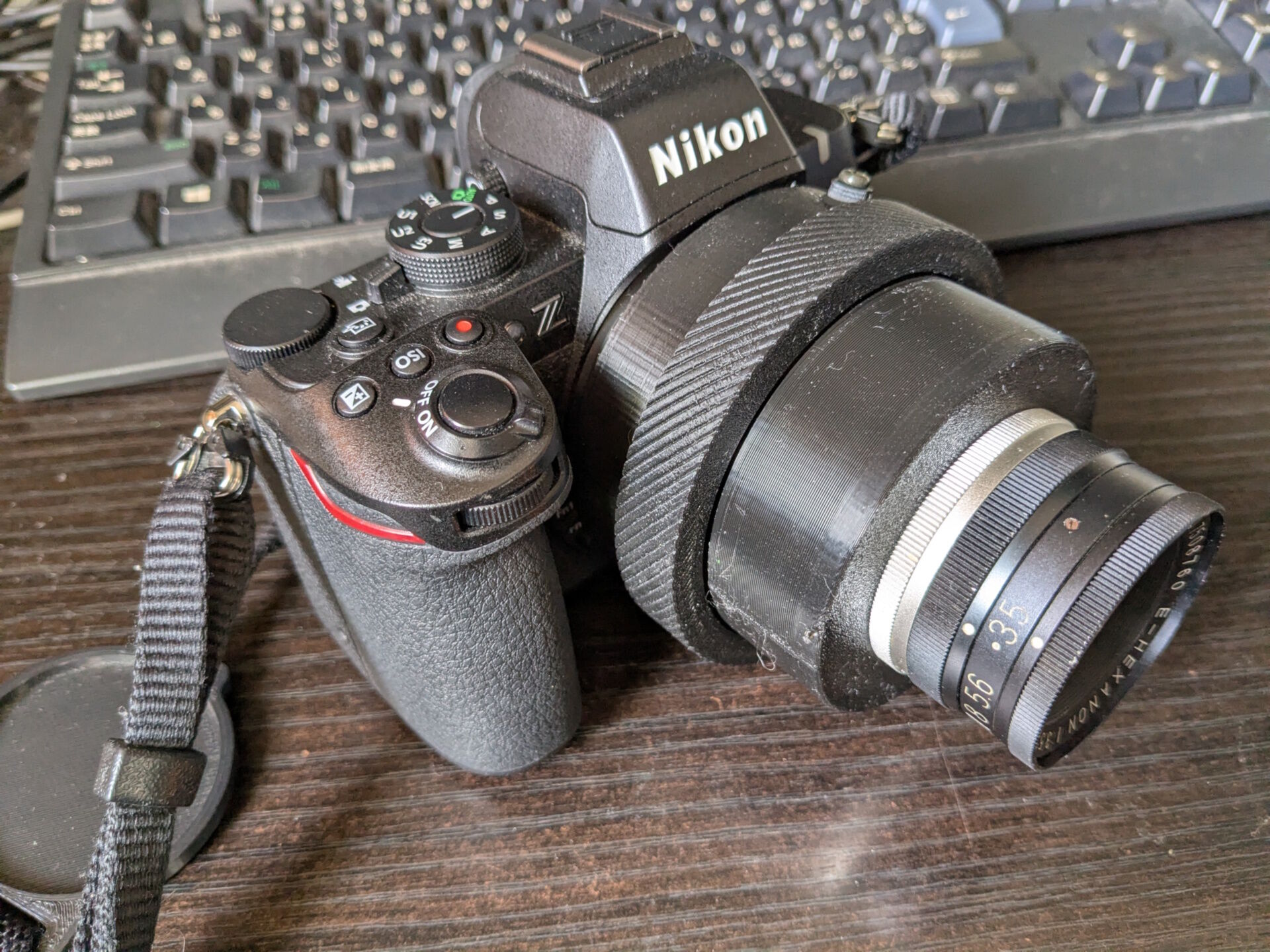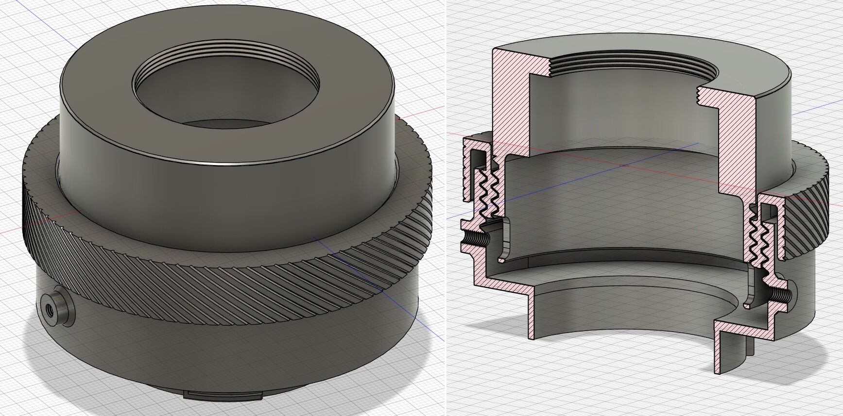 こいつを頂いてきて、マウントをつけることにしましょう。こんな感じの直進ヘリコイドで、上は引き伸ばしレンズのM39P1.0、下側はニコンのZマウントです。Zマウントはボディマウントキャップの3Dデータを頂いてきてくっつけました。