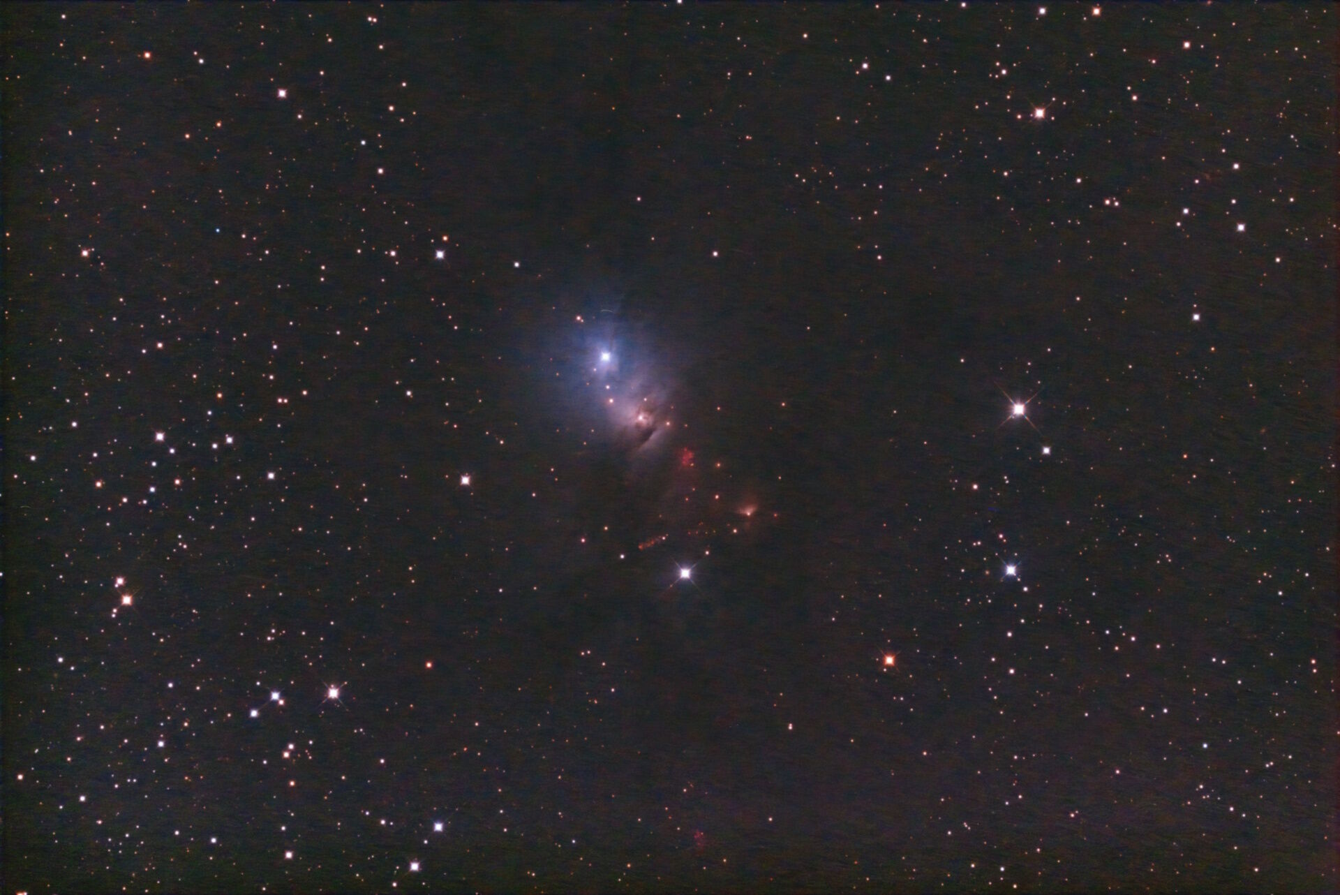 IC348は明るいペルセウスのο星のすぐ下にある散開星団のことらしいですね。で、それを取り囲む反射星雲はIC1985。2分x61枚撮っていますが、だめですねぇ。ノイズに埋もれて全然淡いところが出ません。