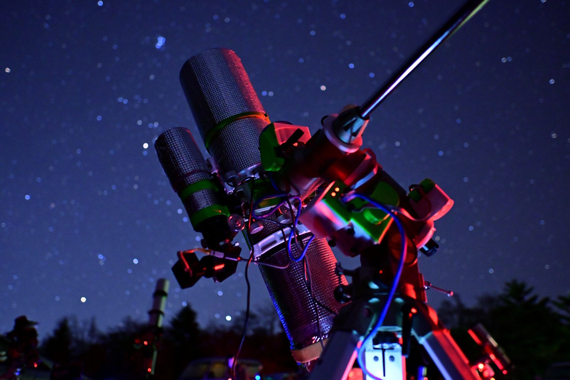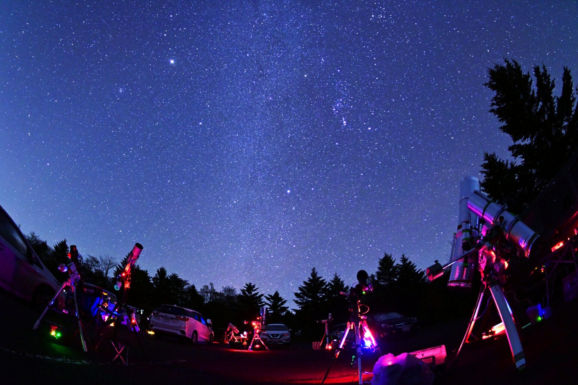 こちらは撮影風景。冬の天の川がまっすぐ立ち上がる下に、たくさんの望遠鏡が空を見上げています。まさに星宴(^^)。