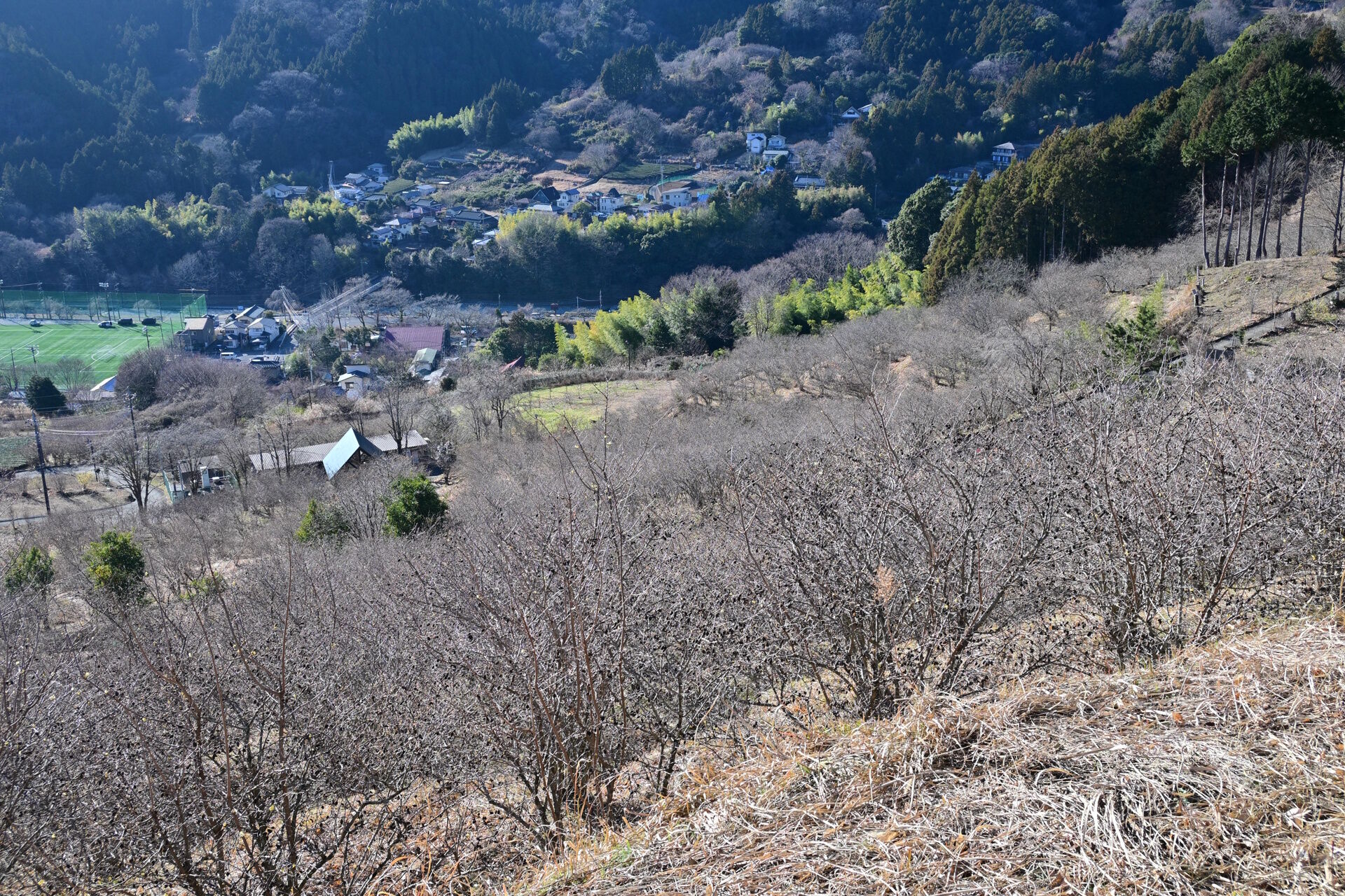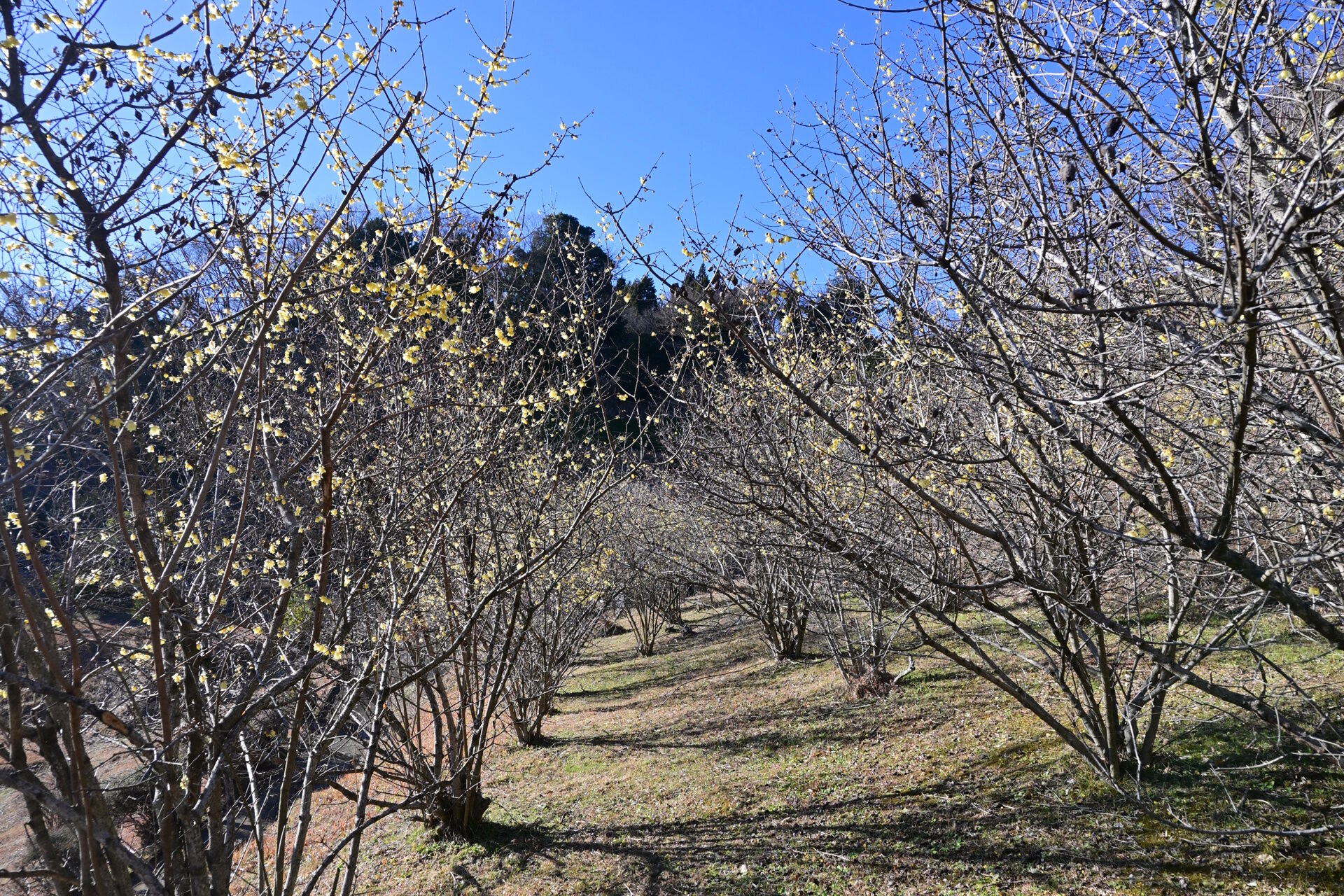 ということで、こちらが丘の上から見た景色。下に見えている低い木はすべて蝋梅。まだチラホラ咲き始めたという段階で、枯れ木がうわっているようにしか見えませんが、ずっと先まであるこれらの木が真っ黄色に染まったら壮観でしょうね。