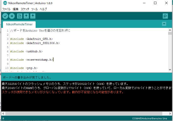で、Adafruit_SSD1306.hとAdafruit_GFX.hをincludeしたところメモリが足らない、、とのこと orz...