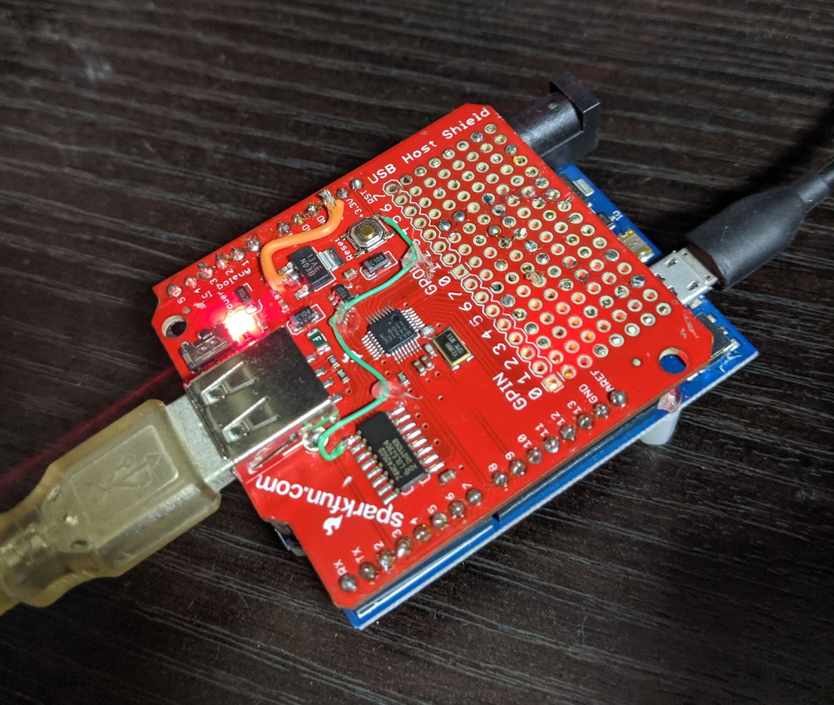 使うのは手元に転がっていたArduino Uno(の互換機)とUSB Host Shield。以前なんかで使ったやつなので、キッタナイww