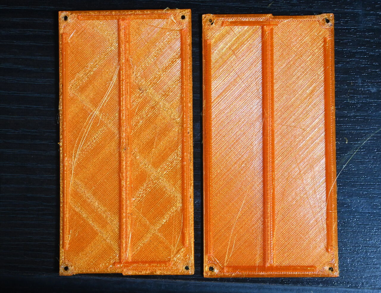 どうも3Dプリンタが不調です。プリントすると、左のように縞模様が出てしまうようになってしまいました。右のきれいに印刷できているのとの違いは印刷速度、左は30mm/s、右は10mm/s。印刷速度を落とせばきれいに印刷できるのですが、時間がかかって大変です。ということで原因追求開始。