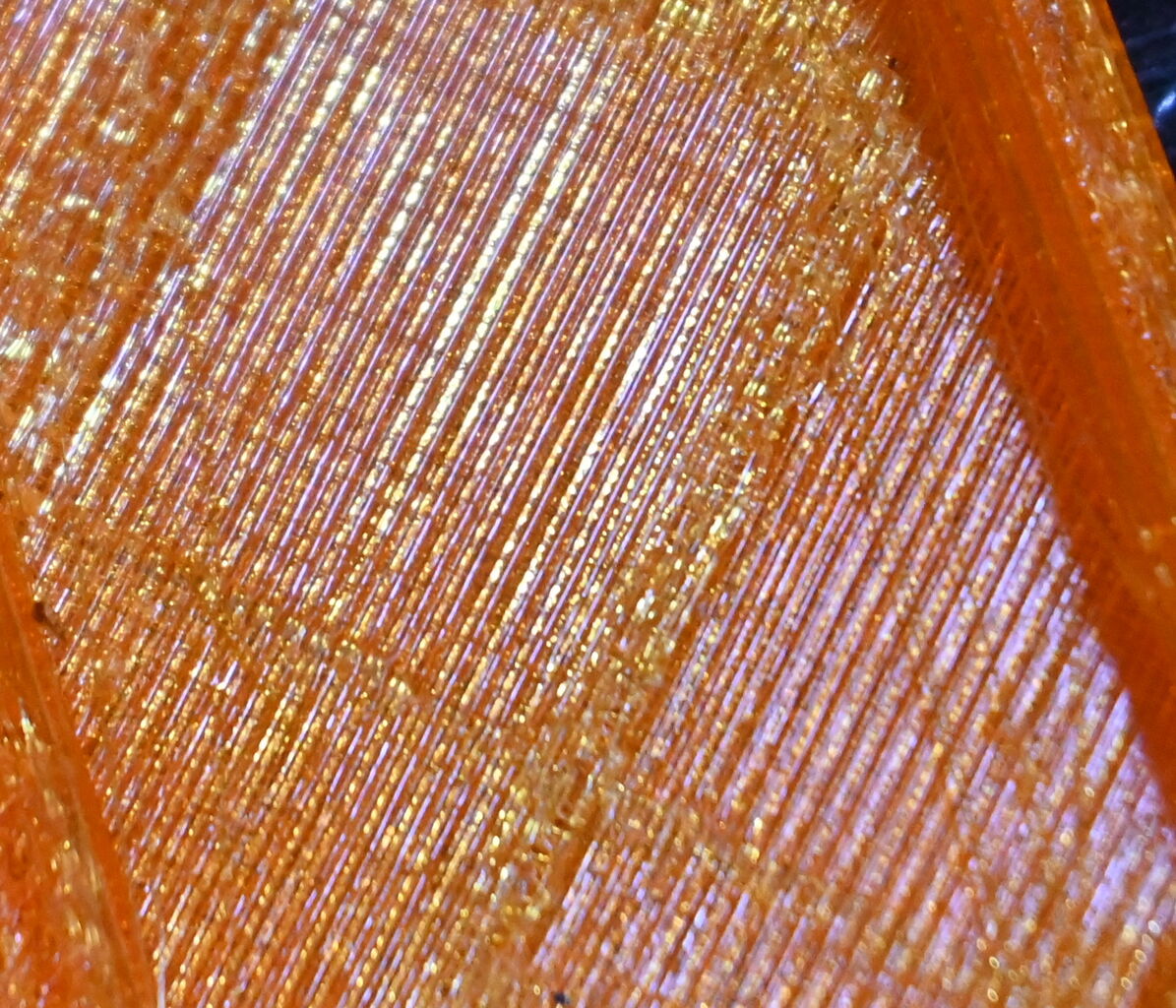 印刷している様子をよく観察してみると、extruderがカツン、カツンとスリップした後このような縞が出ることがわかりました。おそらく詰まるかなにかして吐出の抵抗が大きく30mm/sで吐出できなくなっていて