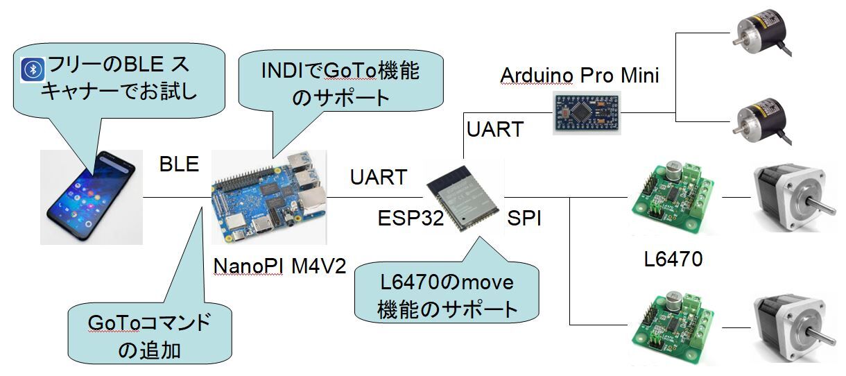 現在のシステム構成はこんな感じです。INDIが動いているNanoPIにUARTでESP32マイコンが接続されています。これは主にステッピングモーターの制御とエンコーダへのデータの中継です。ステッピングモーターはST MicroのL6470というドライバで動かしていて、L6470とはSPIで接続。またエンコーダはAruduino Pro Mini経由でステップ数を取得しています。